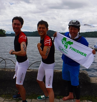 なんとか泳ぎきり、次の西澤選手へバトンタッチし、11キロのアップダウンの激しいコースを走りきり、最後は3人全員でゴーーーーール!!!!!