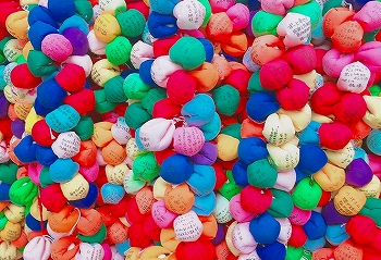 このカラフルなお手玉のようなものは、〔くくり猿〕と呼ばれるもので、これに願いを書いて吊るすと願いが叶うそうです☆